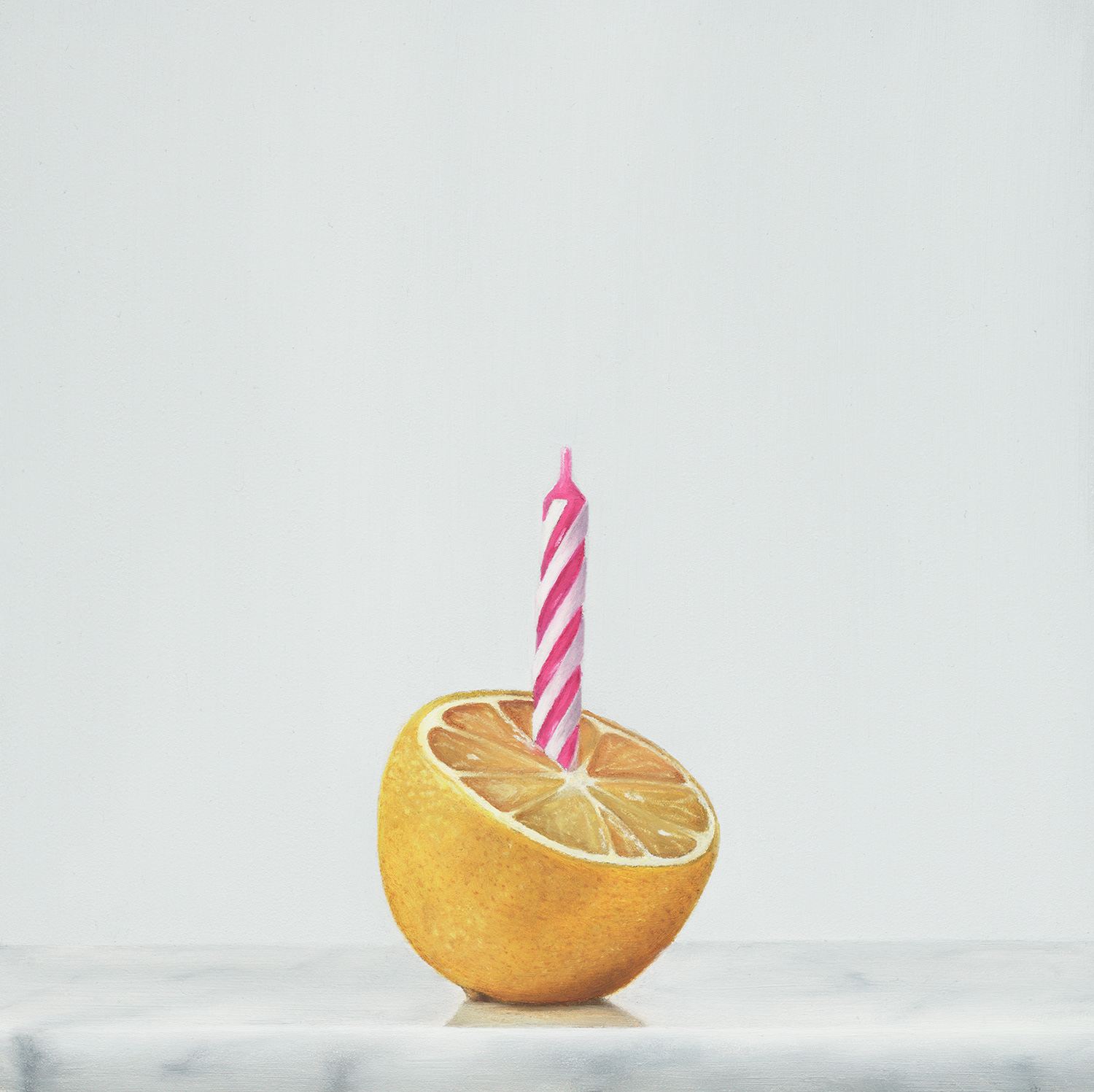 Birthday Lemon #1, 2025. Oil on panel. 8 x 8 inches.